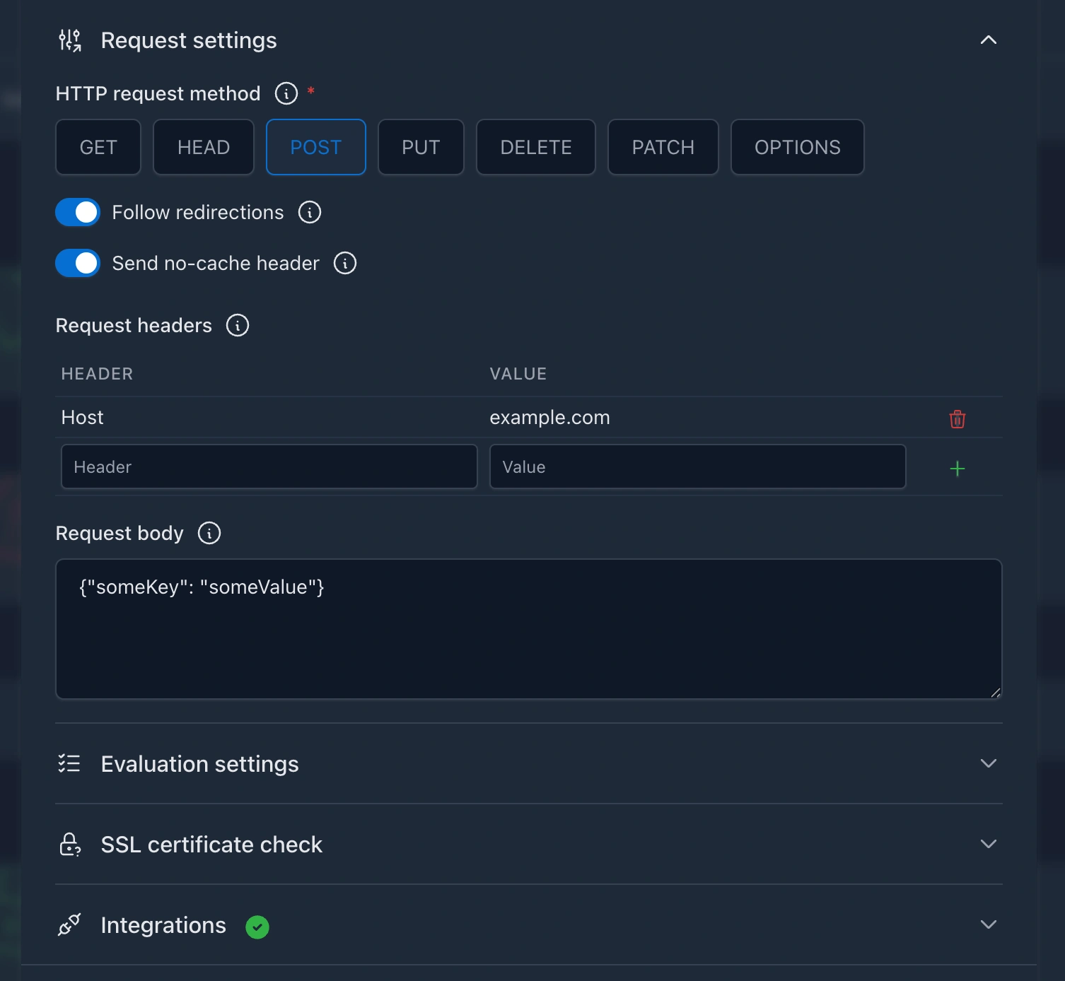 - Custom request body: you can send your own JSON body to the monitored HTTP endpoint, which can be useful for testing APIs that require a specific payload. See the HTTP monitors > Request body section for more details.