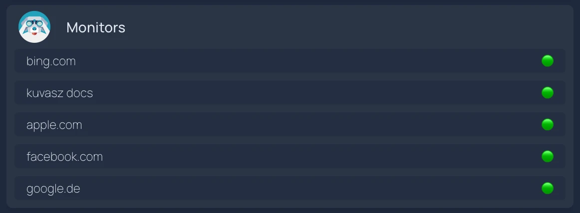 Kuvasz can be easily integrated with Home Assistant using the RESTful integration by using its API. This allows you to create sensors for your most precious monitors and use them in your automations, scripts, or just to visualize the status of your monitors. You can even build your own custom dashboard with the data from your monitors!