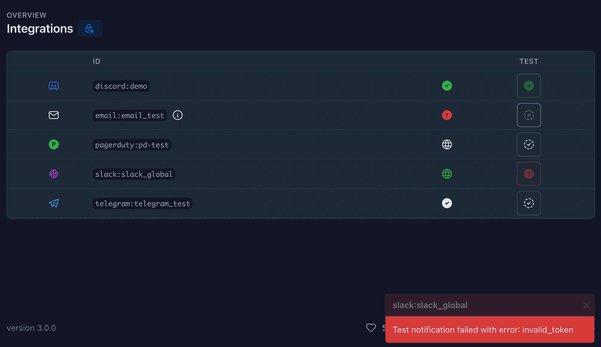 - From the web interface by navigating to the Integrations page and clicking the button next to the integration you want to test. In this case you'll see the result in a visual way, at the same place where you initiated the test.
